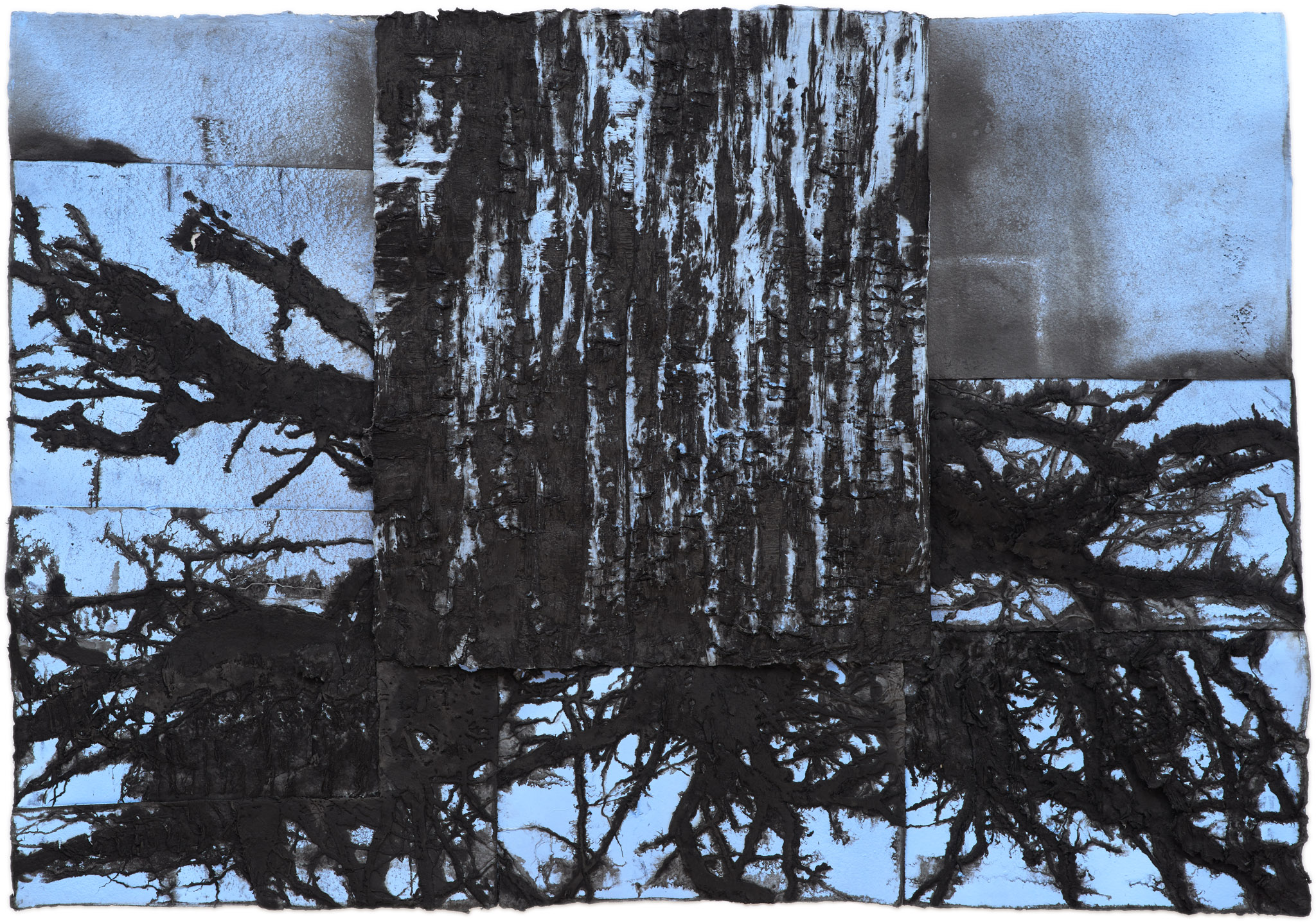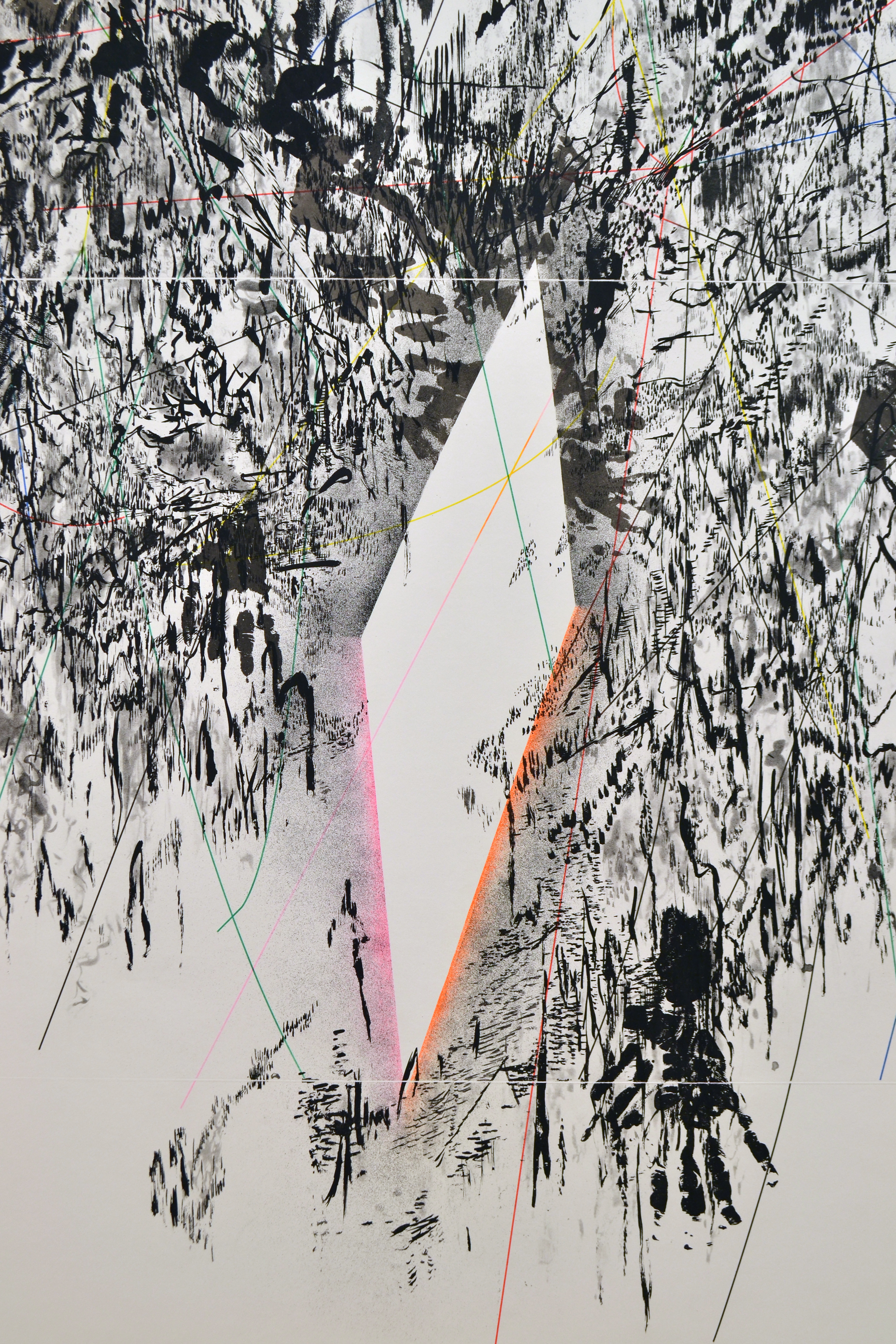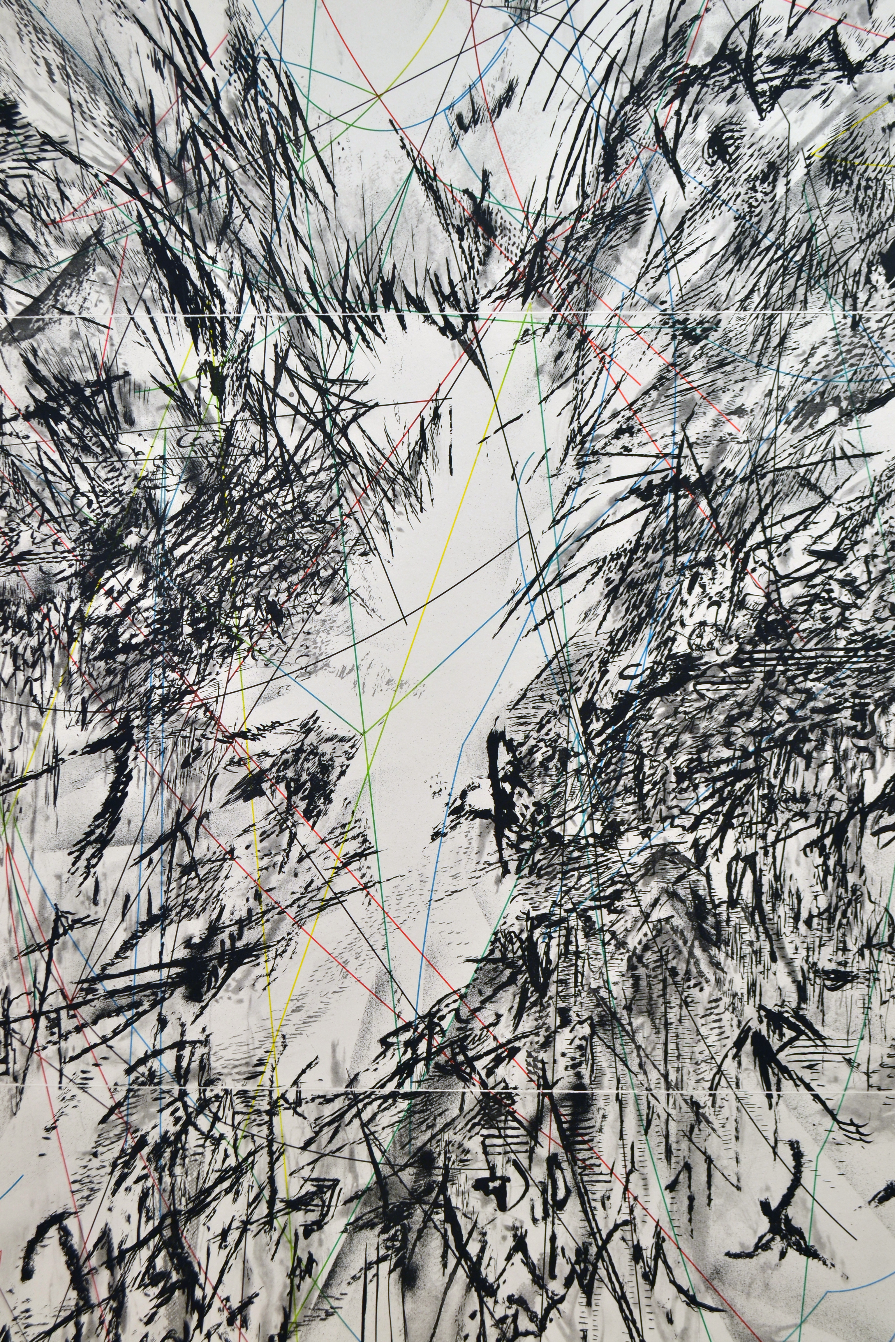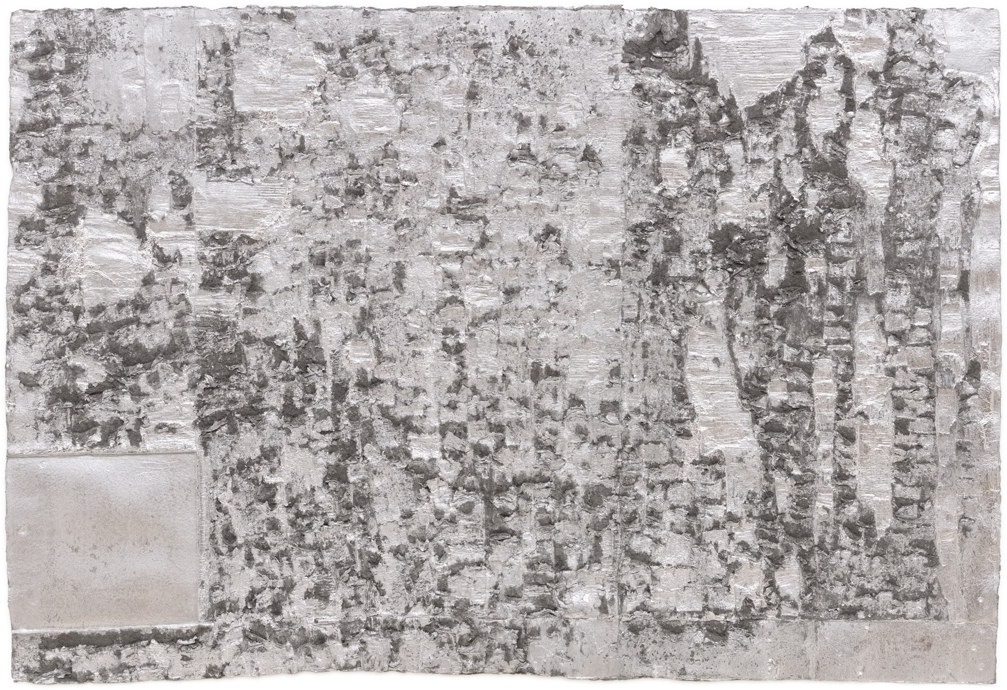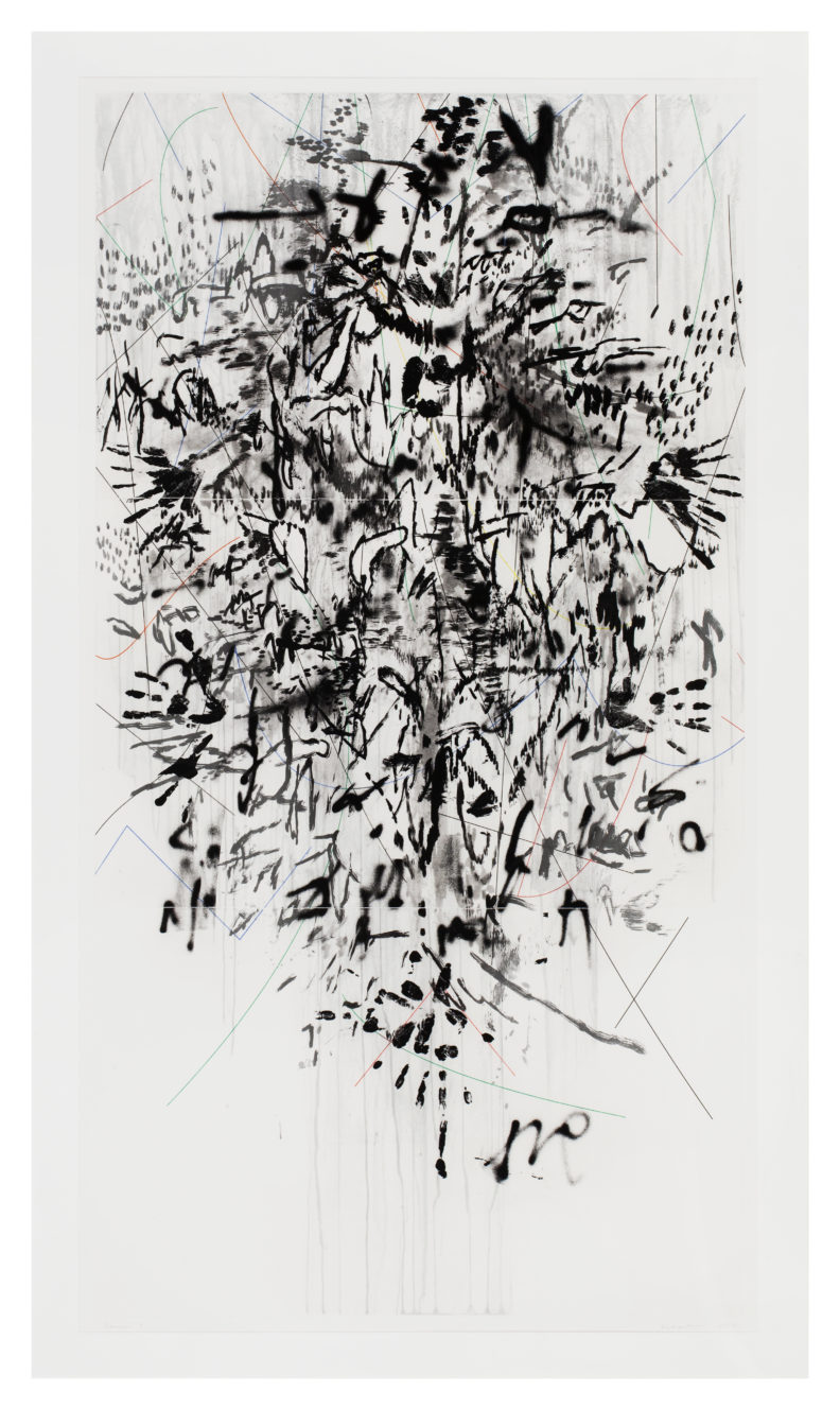 The term ‘Social Abstraction’ has been associated with Bradford’s practice of combining society’s ephemera with the now 100-year-old genre of abstraction. Bradford’s art reflects “the white noise out there in the streets,” using the discarded materials of urban life. Drew’s paper casts employ processes of weathering, decay, and absence. These are themes the artist links to the housing projects and adjacent landfill where he lived as a child and teen. Countering utopian urges, Mehretu’s dense works resemble complex maps of social networks, upheaval, and human migration, and Mutu’s dismembered relic-like forms evoke past violence and conflict.