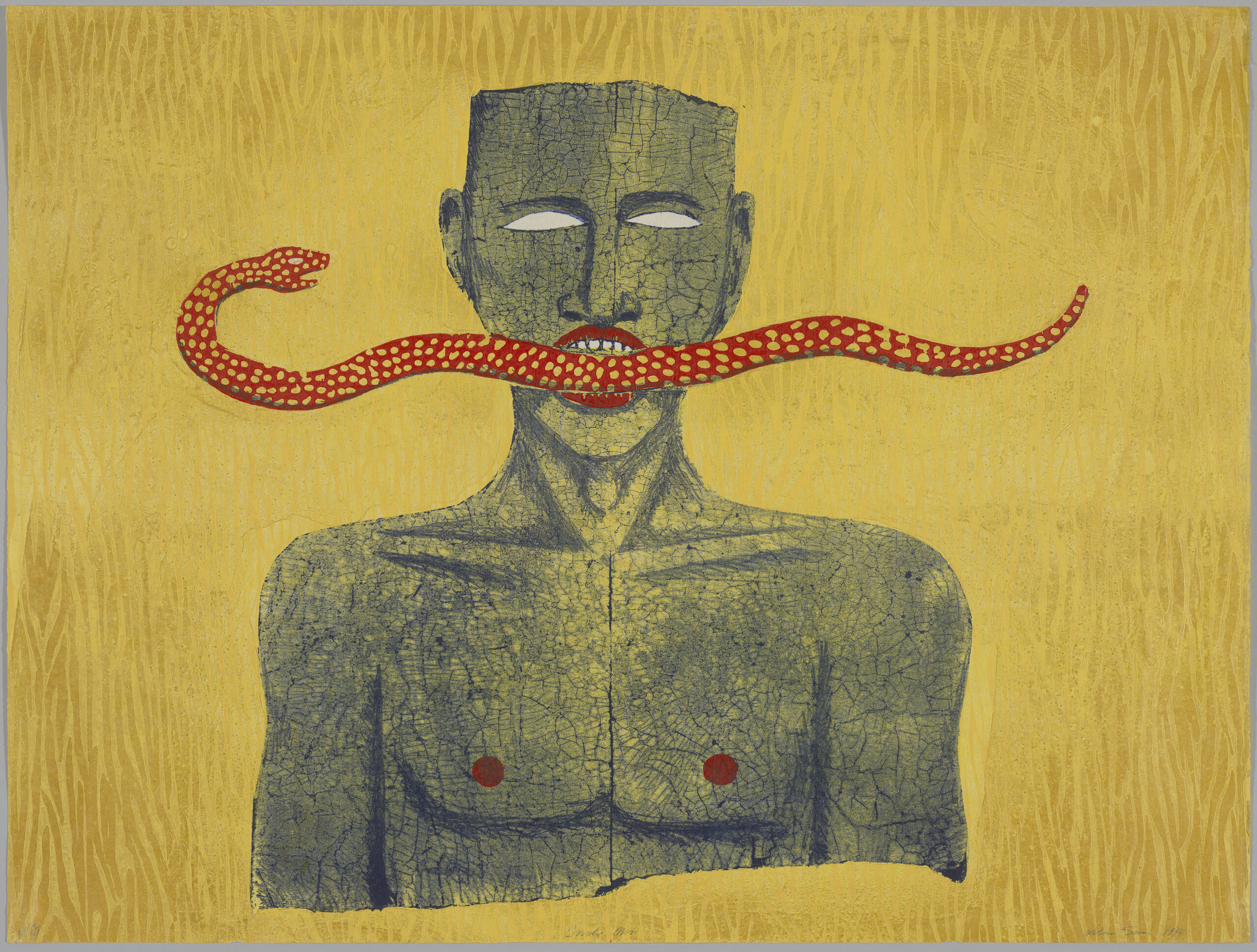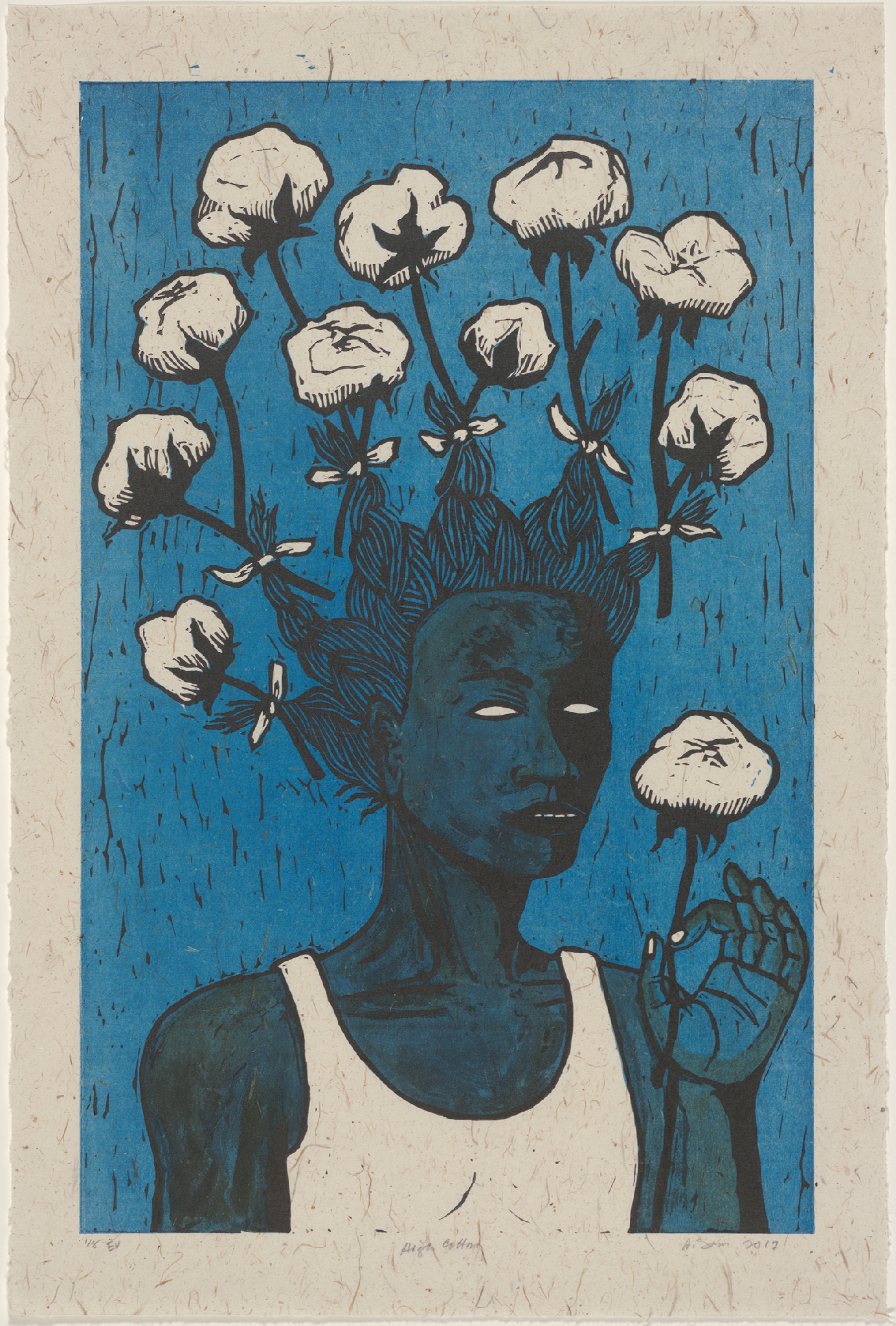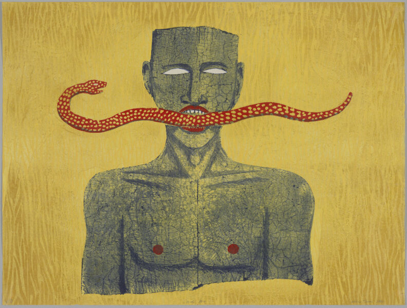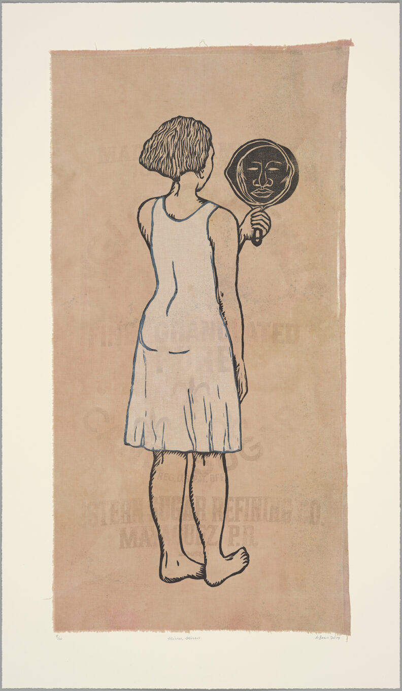 Mirror Mirror: The Prints of Alison Saar features nearly 50 prints and five sculptures by the Los Angeles–based artist over the past 30 years. Her lithographs, etchings and woodblock prints are evocations of the sculptures for which she is renowned. Saar undertakes printmaking with the same tangible approach to unconventional materials and methods found in her sculpture. Cast-off objects such as old chair backs and found ceiling tin become the foundations for etching or lithography plates. Carved wooden panels used for wood block prints echo similar techniques established in her hewn wooden forms. In addition to printing on paper, Saar also employs a variety of used fabrics like vintage handkerchiefs, old shop rags and antique sugar sacks that are layered, cut, sewn and collaged―empowering the content of the image while resisting the flat repetitive nature of the medium.