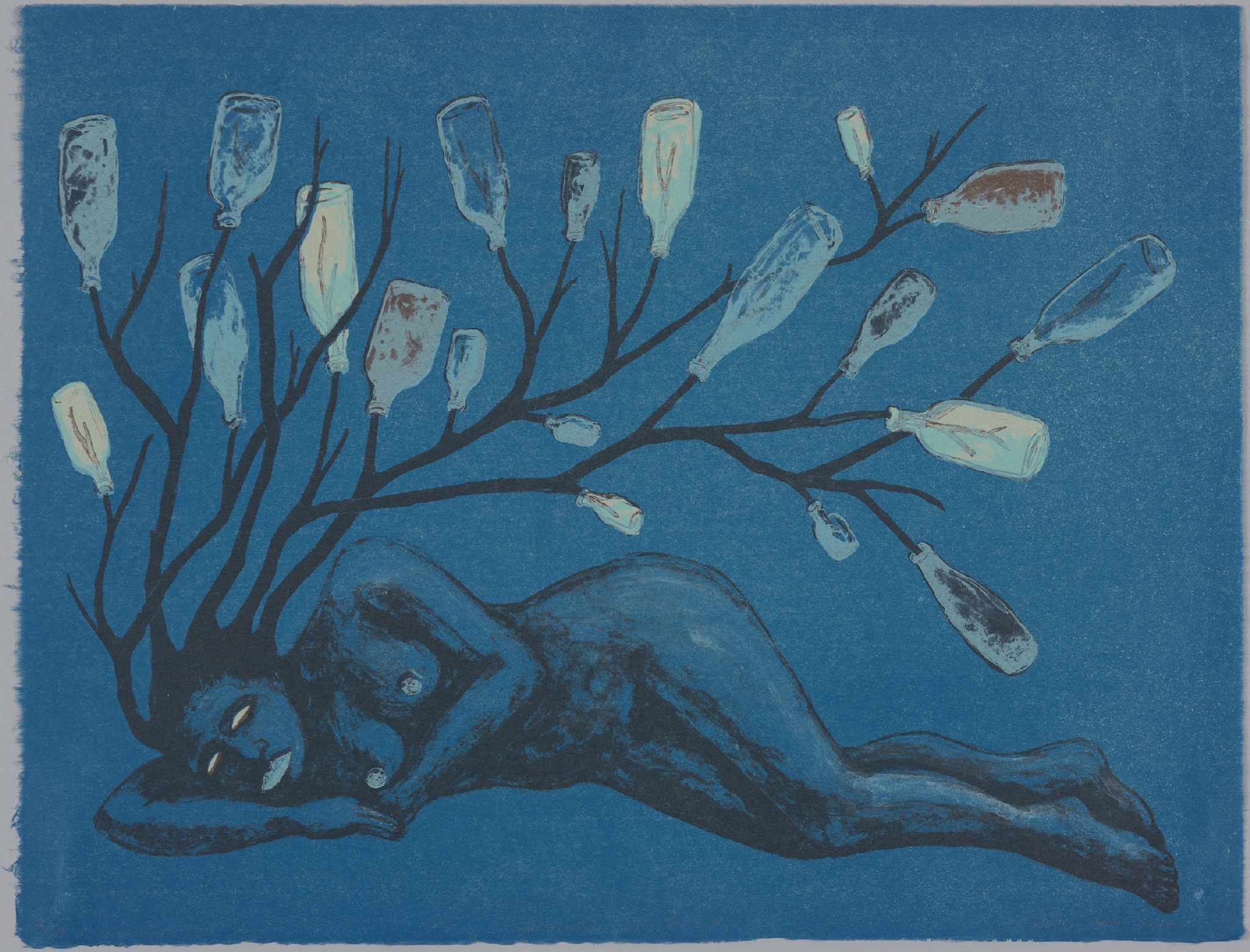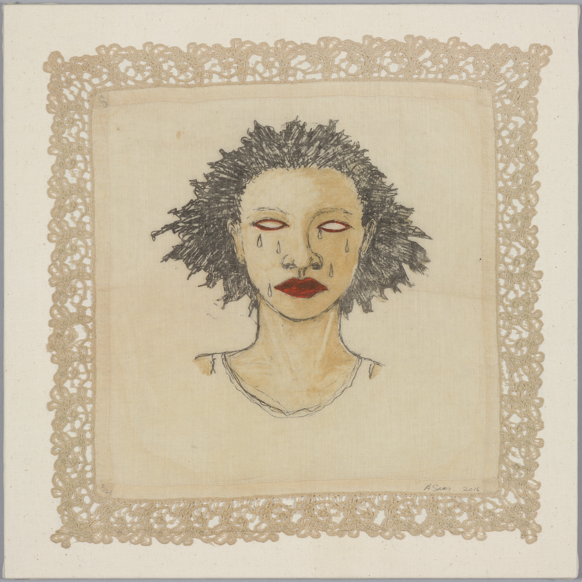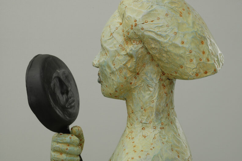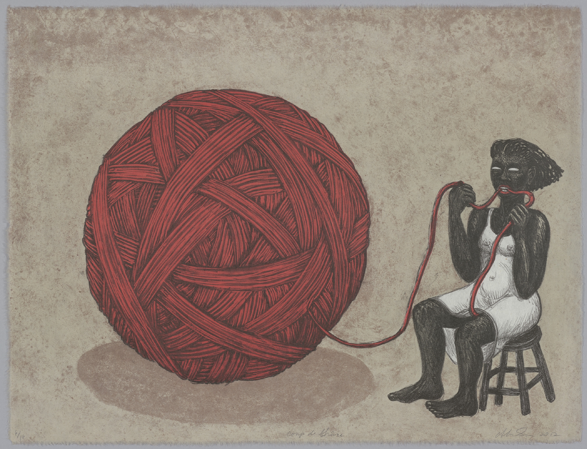 Mirror Mirror: The Prints of Alison Saar features nearly 50 prints and five sculptures by the Los Angeles–based artist over the past 30 years. Her lithographs, etchings and woodblock prints are evocations of the sculptures for which she is renowned. Saar undertakes printmaking with the same tangible approach to unconventional materials and methods found in her sculpture. Cast-off objects such as old chair backs and found ceiling tin become the foundations for etching or lithography plates. Carved wooden panels used for wood block prints echo similar techniques established in her hewn wooden forms. In addition to printing on paper, Saar also employs a variety of used fabrics like vintage handkerchiefs, old shop rags and antique sugar sacks that are layered, cut, sewn and collaged―empowering the content of the image while resisting the flat repetitive nature of the medium.